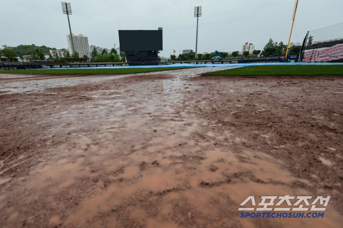 광주기아챔피언스필드도 전날 폭우의 영향을 받긴 마찬가지. 그라운드 관리자들이 이날 오전 비가 멈춘 틈에 마른 흙을 덮으며 정비 작업을 했지만, 이내 방수포를 덮으며 오후 4시 이후 비 예보를 대비했다.