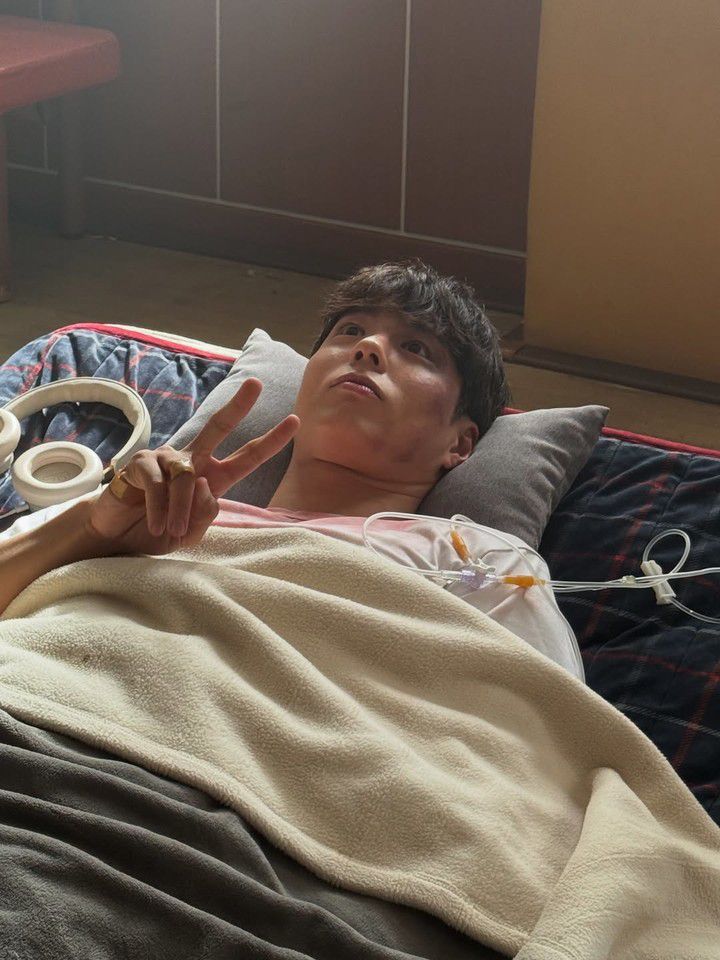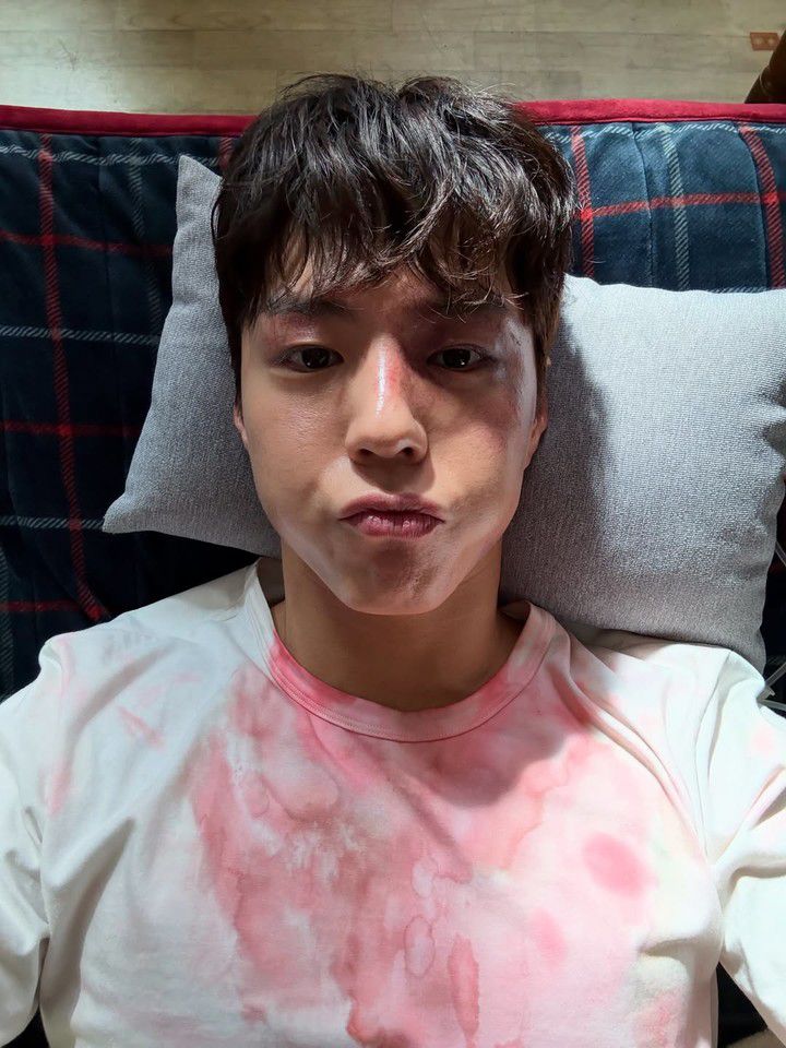 누워서 회복 중인 모습에서 '브이' 포즈를 취하고 있는 박보검의 표정에 장난기가 담겨 있다. 어느 상황이던 그만의 매력과 유머를 잃지 않는 모습이 인상적이다.