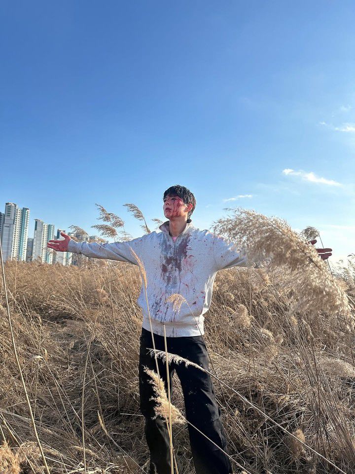 얼굴에 상처와 멍 분장을 한 상태지만, 여전히 강렬한 카리스마가 느껴진다. 배우로서의 진지함과 열정을 엿볼 수 있으며 외적인 분장과 무관하게 그의 내면의 강한 면모가 더욱 돋보인다.