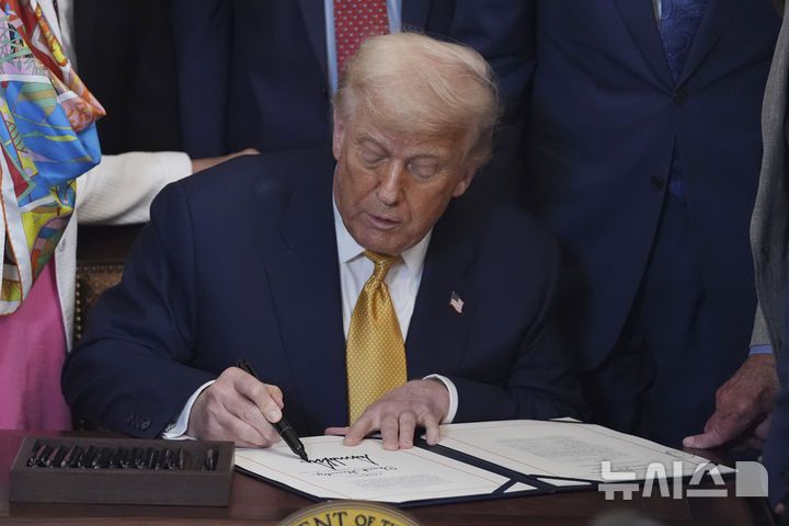 [워싱턴=AP/뉴시스] AP통신, 뉴욕타임스, CNN 등에 따르면 미 하원은 찬성 216, 반대 213으로 예산 삭감안을 통과시켜 트럼프 대통령에게 최종 승인을 요청했다. 사진은 도널드 트럼프 미국 대통령이 법안에 서명하고 있는 모습. 2025.07.18. |
