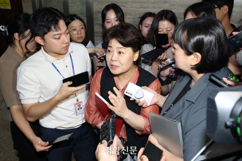 윤희숙 국민의힘 혁신위원장이 지난 17일 국회에서 당 지도부와 만난 뒤 기자들 질문을 받고 있다. 권도현 기자 |