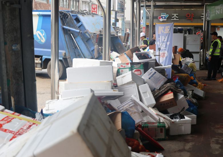 18일 오전 집중호우 피해를 당한 충남 당진시 읍내동 당진전통시장에서 복구작업이 진행되고 있다. 연합뉴스