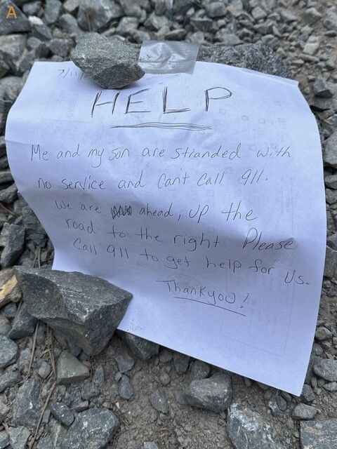 이 같은 방식으로 약 4시간 동안 수색을 이어가던 중 수색팀은 바람에 날아갈까 봐 돌멩이로 눌러 고정해놓은 쪽지 하나를 발견했다. 이 쪽지에는 "HELP(도와주세요) 나와 내 아들이 휴대전화가 먹통인 채 발이 묶여 있어요. 우리는 오른쪽 도로 위쪽에 있어요. 911에 전화해서 구조를 요청해주세요. 감사합니다"라고 쓰여 있었다.
