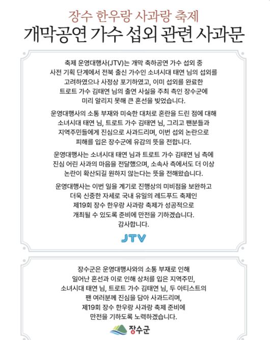 김태연이 출연을 철회한 뒤 장수군 측은 대행사와 함께 사과문을 내고 양측에 공식 사과를 전했다. 18일 장수군 공식 SNS를 통해 축제 운영대행사(JTV) 측은 “개막 축하공연 가수 섭외 중 사전 기획 단계에서 전북 출신 가수인 소녀시대 태연 님의 섭외를 고려하였으나 사정상 포기하였고, 이미 섭외를 완료한 트로트 가수 김태연 님의 출연 사실을 주최 측인 장수군에 미리 알리지 못해 큰 혼선을 빚었습니다”라고 설명했다.