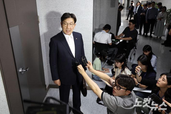 국민의힘 권성동 의원이 18일 서울 여의도 국회 의원회관 자신의 의원실 앞에서 김건희 특검의 압수수색과 관련 입장을 밝히고 있다. 윤창원 기자 |