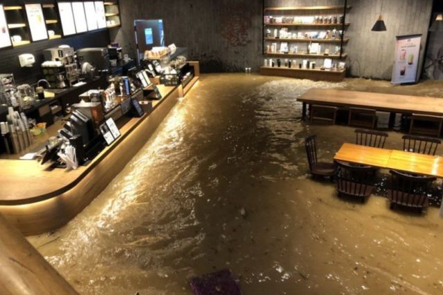 매장 2층에서 1층을 내려다보며 찍은 것으로 추정되는 사진에는 흙탕물이 닫힌 현관문을 밀고 들어와 1층을 완전히 뒤덮은 모습이 담겼다. 물은 의자와 테이블의 다리가 충분히 덮이는 높이까지 들어찼고, 매장 곳곳에는 의자와 테이블이 물에 둥둥 떠다니기도 했다.