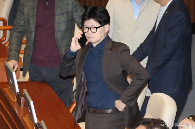(서울=뉴스1) 이광호 기자 = 윤석열 대통령이 비상계엄령을 선포한 가운데 4일 새벽 서울 여의도 국회 본회의장에서 한동훈 국민의힘 대표가 심각하게 전화통화를 하고 있다. .2024.12.4/뉴스1 Copyright (C) 뉴스1. All rights reserved. 무단 전재 및 재배포, AI학습 이용 금지. /사진=(서울=뉴스1) 이광호 기자 |