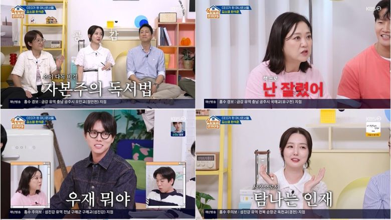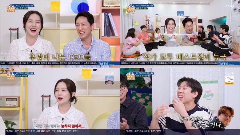이어 한석준과 김소영은 사업 근황에 관해 밝혔다. 김소영은 '책을 좋아하는 남편과 어째서 책방 사업을 같이 하지 않냐'는 질문에 "제 남편은 그저 기쁨을 주는 존재"라면서 "남편은 돈을 버는 일에 능하지 않다. 책을 많이 읽고 즐겁게 있다가 자는 거다"라며 오상진과의 동업을 칼차단해 웃음을 자아냈다.