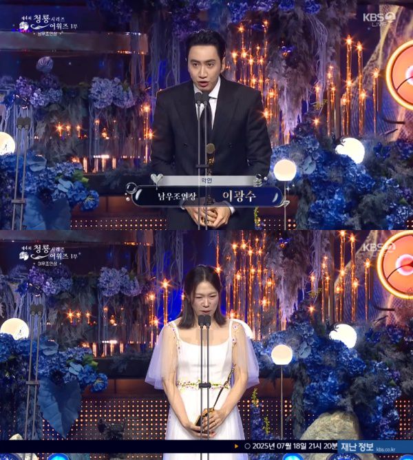 이날 남우조연상은 넷플릭스 오리지널 시리즈 '악연' 이광수가 수상했다. 그는 "정말 예상을 못 했다"며 "도경수 씨가 꿈을 꿨다고 알려줬는데, 꿈에서 제가 모발 이식 수술을 하다가 감염돼 죽었다더라. 심하게 욕을 하고 끊었는데 찾아보니 길몽이었다"며 절친한 동료 도경수의 예지몽을 언급했다.
