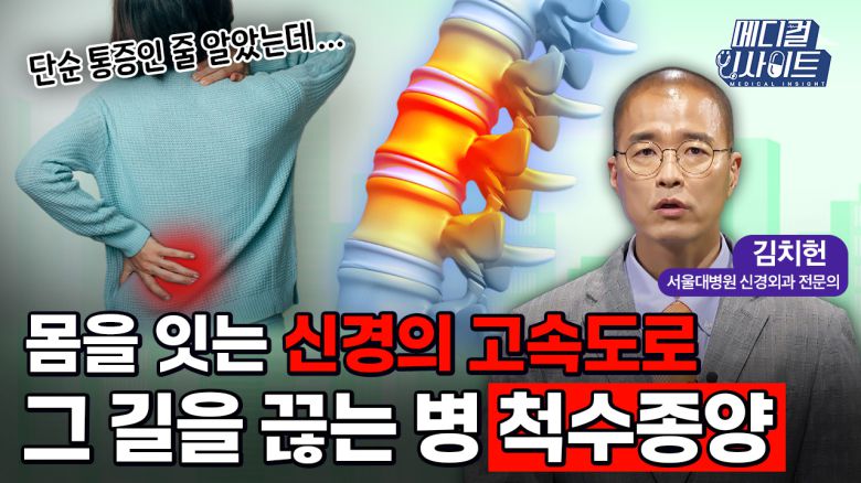 ◆ 김치헌 : 자, 그러면 이런 증상이 척추종양에만 국한돼 있느냐 그렇지 않습니다.어 퇴행성 질환이 가장 흔한 척추 질환이고 여러분들이 잘 알고 계시는 척추 디스크 질환 협착증 등의 증상들과 많이 겹칩니다. 디스크 질환 협착증으로도 통증이 생기고 팔· 다리에 통증이 생기는 방사통 또는 힘 빠진 이 생길 수 있습니다.그렇기 때문에 보통 이런 증상이 생기면 퇴행성 질환이라고 많이들 생각을 하시는데요.하지만 퇴행성 질환이라 하더라도 다음과 같은 적색경보가 있으면 종양이나 아니면 감염 같은 질환을 의심해야 한다고 교과서적으로 얘기를 하고 있습니다. 저희가 환자를 만나면 환자분과 대화를 통해 가지고 이게 어떤 상황일지 예측을 하는데요.통증이 환자분이 말씀하실 때 이게 움직일 때 더 아프고 누울 때 나아진다라고 한다면 일반적으로는 퇴행성 질환 통증을 생각을 합니다. 하지만 누워도 계속 아프고 통증이 자꾸 진행을 하고 잠도 못 잘 정도로 아프고 한 달 정도 약도 먹고 주사 치료도 했는데 계속 아프다라고 한다면 이거는 그 퇴행성 질환이 아닌 다른 질환이 아닐까 한 번쯤은 생각을 해 봐야 됩니다.그리고 처음에 통증이 생겼을 때 별로 다치지도 않았는데 너무 큰 통증이 생겼다 그러면 좀 심상치 않다 생각을 해 봐야 되고요. 예전에 만약에 암을 앓았고 물론 완치가 됐다 하더라도 병력이 있거나 아니면 스테로이드나 면역억제제 또는 주사 같은 약을 오랫동안 써왔던 분들은 혹시라도 감염이 되지 않았나 생각을 해 봐야 되고요.만약에 체중이 최근에 많이 감소했다 예를 들면 뭐 두 달 사이에 분명히 잘 먹고 했는데 그냥 살이 쭉쭉 빠져서 5kg 빠졌다라고 한다면 이건 뭔가 몸에서 이 체중을 감소시키는 원인이 있지 않나 생각을 해 봐야 합니다. 저희가 환자분을 문진하고 나면 그다음에는 이학적 검사라는 걸 합니다.그래서 의사분들이 환자분들을 만져봐서 힘도 보고 그리 툭툭 쳐가면서 반응도 보고 하는데요. 그러면서 이상을 감지를 합니다. 만약에 힘이 너무 많이 빠져 있다든지 걸을 때 균형 잡히는 게 좀 이상하다든지 아니면은 말씀하시는데 이게 배뇨 곤란·변실금 등이 좀 확실하게 좀 문제가 있어 보이고 저희가 또 환자분을 검진할 때 고무망치로 여기도 쳐보고 여기도 쳐보고 무릎도 쳐보고 하는데, 만약에 정상적으로 이 정도 움직여야 하는데 이게 툭툭 심하게 움직인다든지 또는 손가락을 쳐봐도 손가락이 까딱까딱 움직이는 이게 어린아이들한테 보이는 그런 반사인데 만약에 성인한테 보이면 머리 쪽에서 아래로 내려가는 이런 신경들의 지배가 떨어지면 생기는 병적 반사를 시사를 하고 만약 그런 게 있는 경우에는 혹시라도 어떤 덩어리 같은 게 신경을 누르지 않나 의심을 해봐야 합니다.물론 눌러서 아프거나 쳐서 아프거나 하는 게 있다면 그쪽에 염증이 있나도 의심해 봐야 되고 피검사를 해봤는데 백혈구 수치가 너무 높다든지 아니면 단백질 수치가 너무 올라가 있다 라고 한다면은 혈액암이 있지 않나 의심해 봐야 되고, 염증 수치가 올라가 있거나 아니면은 뼈 파괴가 되면 나타나는 그런 수치들이 올라가 있으면 이게 뼈 쪽에 만약에 종양을 갉아먹고 있는 뭐가 있지 않나 생각을 한번 해 봐야 됩니다.