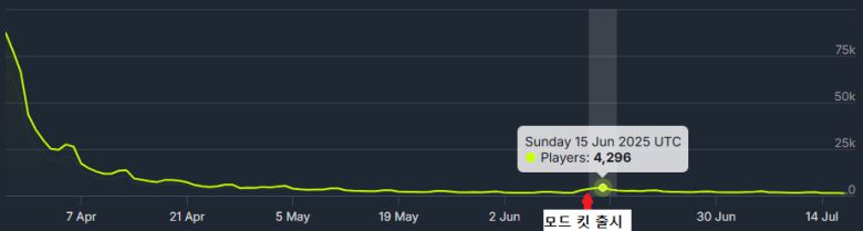 지난 6월 13일 모드 킷 출시 이후 약 3천 명 가량 동시 접속 유저가 늘었지만 다시 서서히 감소해 스팀의 최근 평가는 복합적에서 헤어나오지를 못하고 있는 실정이다