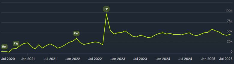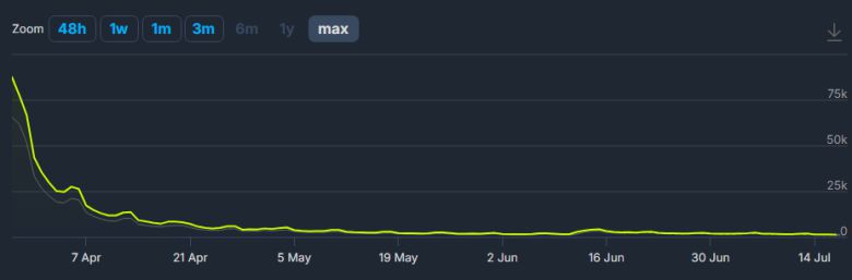 그러나 지난 3월 28일 얼리액세스 출시 이후 관심도는 빠르게 줄어들었다. 불과 1주일이 경과하기 전에 절대적으로 부족한 컨텐츠량 등의 이유로 약 6만 명의 활성 유저가 줄어드는 모습을 볼 수 있고, 이후 일시적으로 반등하나 곧 빠르게 우하향 그래프를 보여주면서 현 시점에는 1000명 내외의 동시 접속 유저 수를 기록하고 있다.