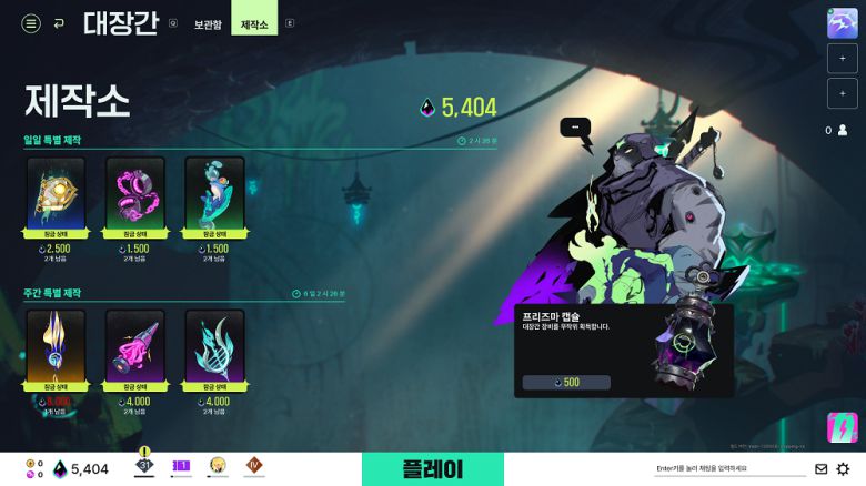 대장간은 프리즈마를 사용해 특정 장비 아이템을 구매하거나 무작위로 장비 아이템을 뽑아 실제 게임 내에서도 등장하게 만드는 시스템이다. 확실히 처음에 대장간을 아예 손대지 않은 상태에서 매칭을 했을 때에는 상점에 변변찮은 장비만 나오던 것과 달리, 미리 준비된 프리즈마를 사용해 대장간에서 장비 뽑기를 사용한 뒤 뽑은 장비들이 상점에 추가되는 것을 확인할 수 있었다.