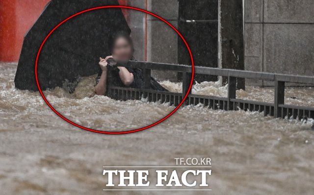 토요일인 19일은 전국이 대체로 흐리고 대부분 지역에서 비가 내리겠다. 경남과 광주를 중심으로 강하고 많은 비가 내릴 것으로 예보됐다. 사진은 지난 17일 하루동안 400mm가 넘는 폭우가 내린 광주에서 한 시민이 북구청 앞 도로에서 물살에 휩쓸려 난간을 붙잡아 버티고 있는 모습. /뉴시스 |