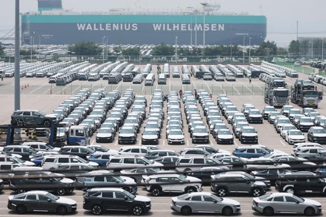 7일 오후 경기 평택시 포승읍 평택항에 수출용 차량들이 세워져 있는 모습. 뉴스1 |