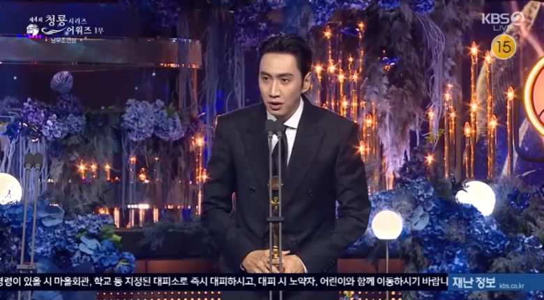 그는 "얼떨떨하다. 제가 받은 상은 아니지만 저도 수상소감을 할 수 있게 기회를 주셔서 감사하다. 집에서 보고 있을 가족들, 지금 딱 생각나는 게 가족들"이라며 "아빠가 상 받은 건 아니야. 그래도 우리가 같이 상 받은 거야"라고 외쳐 미소를 자아냈다.