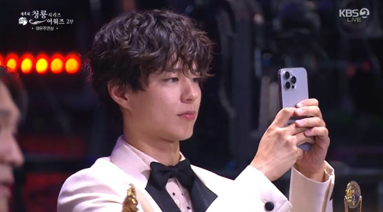아이유는 넷플릭스 '폭싹 속았수다'로 여우주연상을 수상했다. 같은 작품에서 호흡했으나 넷플릭스 '중증외상센터'의 주지훈이 남우주연상을 품에 안으면서 박보검의 수상은 불발된 상황. 박보검은 아이유가 무대에 오르자 곧장 개인 휴대전화로 '직찍'에 나섰다.