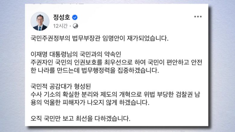 정 장관은 임명안이 재가된 이후 SNS에 올린 글에서 국민적 공감대가 형성된 수사, 기소의 확실한 분리와 제도 개혁으로 위법 부당한 검찰권 남용의 억울한 피해자가 나오지 않게 하겠다고 밝혔습니다.