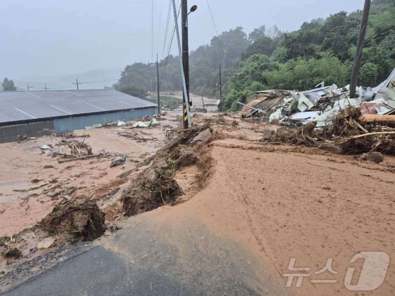 (산청=뉴스1) 박민석 기자 = 경남 산청군에서 유출된 토사에 주민들이 휩쓸려 소방당국이 수색 중이다.