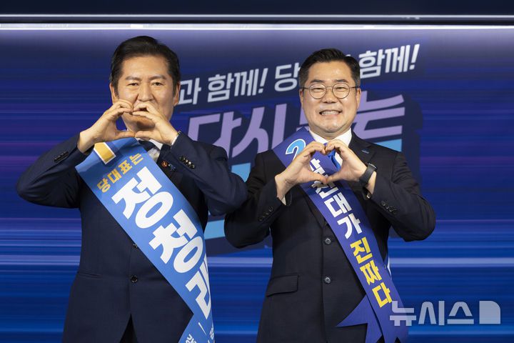 [서울=뉴시스] 김근수 기자 = 정청래(왼쪽) 더불어민주당 당대표 후보자와 박찬대 더불어민주당 당대표 후보자가 19일 서울 여의도 더불어민주당 중앙당사에서 열린 더불어민주당 당대표 및 최고위원 선출을 위한 충청권 합동연설회에 앞서 기념촬영을 하고 있다. 2025.07.19. ks@newsis.com |
