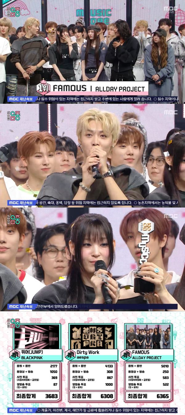 19일 방송된 MBC '쇼! 음악중심'에는 블랙핑크의 '뛰어(JUMP)', 에스파의 '더티 워크(Dirty Work)', 올데이 프로젝트의 '페이머스(FAMOUS)'가 1위 후보에 올랐다.