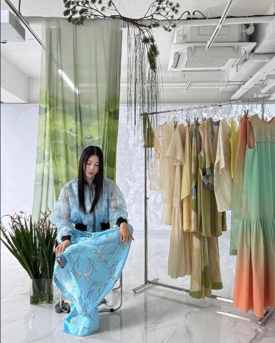 투명한 시스루 소재의 집업 점퍼와 와이드 핏 바지까지 같은 패턴으로 통일해 자연 속에서 막 걸어나온 듯한 ‘화단 인형’ 같은 스타일을 보여줬다. 우아한 반묶음 헤어와 수수한 메이크업으로 화사함을 더했고, 주변에는 생화 장식과 함께 산뜻한 감성이 가득했다.