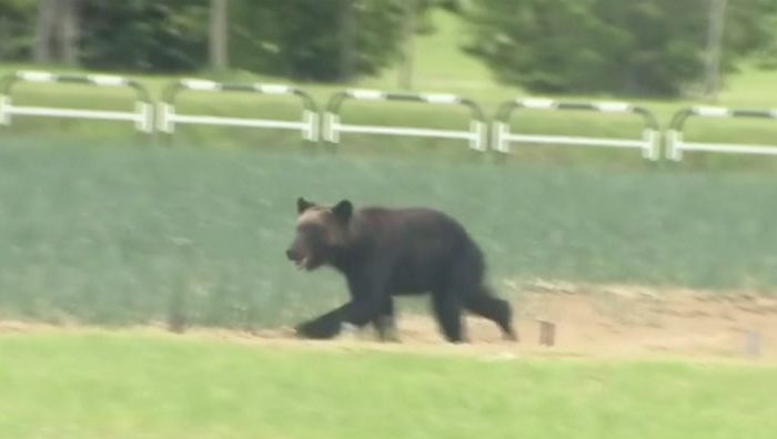 불곰 한 마리가 일본 북부 삿포로의 들판을 달리고 있는 모습.[AP/뉴시스] |