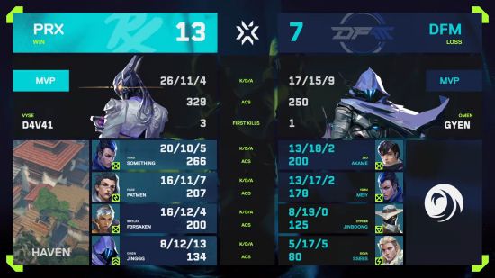 첫 경기 이후 두 번째 맵 헤이븐에 입장한 2팀. 초반 흐름은 앞선 경기처럼 페이퍼 렉스가 좋았다. 8라운드 기준 7대1로 점수를 벌리며 전반전 리드를 일찌감치 확정 지은 것.