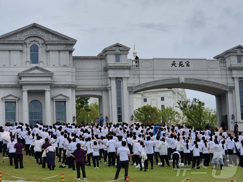 김건희 특검팀이 18일 건진법사 청탁 의혹 관련 경기 가평군 설악면 소재 통일교 본부를 압수수색한 가운데 신도들이 본부 입구에서 예배를 하고 있다. 2025.7.18/뉴스1 ⓒ News1 양희문 기자 |