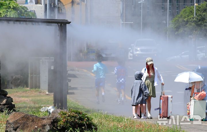 [서귀포=뉴시스] 우장호 기자 = 제주 해안지역을 중심으로 폭염특보가 내려진 18일 오전 서귀포시 자구리공원 내 쉼터에서 더위를 식히는 쿨링포그가 가동되고 있다. 기상청은 최근 이어진 흐린 날씨로 해제됐던 폭염주의보를 이날 오전 제주도 북부, 서부, 동부 지역에 다시 발효했다. 2025.07.18. woo1223@newsis.com