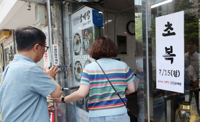 [서울=뉴스핌] 이호형 기자=초복을 하루 앞둔 14일 서울 중구의 한 삼계탕전문점에 시민들이 들어서고 있다.  한국물가정보는 삼계탕 재료 슈퍼마켓과 대형마트에서 구매 비용은 4인분 기준 각각 4만2천150원, 4만3천360원으로 집계됐다고 밝혔다. 한편 한국소비자원 가격정보종합포털 '참가격'에 따르면 서울 기준 삼계탕 한 그릇 외식 가격은 지난달 평균 1만6천885원이다 2024.07.14 leemario@newspim.com