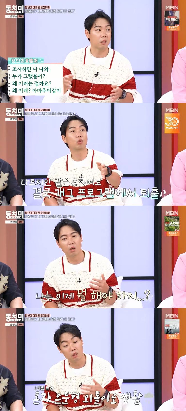 2014년도 '개그콘서트'에서 퇴출당했다는 황현희는 "잘리고 나서 고민하기 시작했다. '과연 나는 그럼 뭘 해야 되는 건가?'라고 생각했고, 6개월 정도를 은둔형 외톨이로 혼자 지냈다"고 털어놨다.