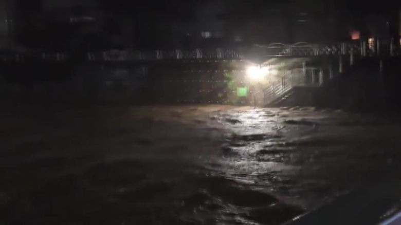계단과 하천 변이 맞닿는 부분이 전혀 보이지 않을 정도로 물이 불어난 모습입니다.