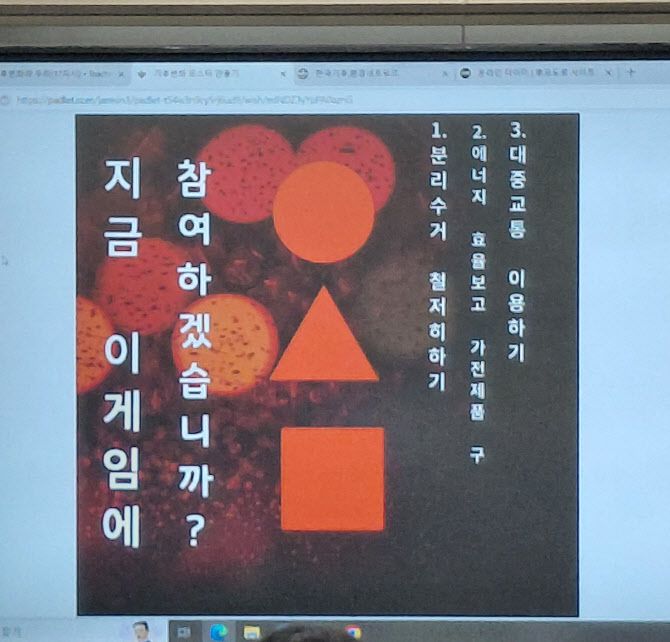 [이데일리 김응열 기자] 칠판 가운데 놓인 대형 모니터 화면 위에 넷플릭스 드라마 ‘오징어게임’을 연상시키는 포스터가 띄워졌다. 위에서 아래로 빨갛게 그려진 원, 삼각형, 사각형 오른쪽에는 ‘분리수거 철저히 하기’, ‘에너지 효율보고 가전제품 구매’ ‘대중교통 이용하기’라는 문구가 쓰였다. 포스터는 ‘지금 이 게임에 참여하시겠습니까’라고 제안하고 있었다.