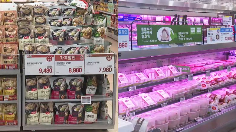 식품 코너 매대에는 저렴한 가격의 간편식 삼계탕이 전진 배치됐습니다.