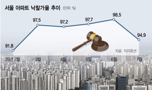 20일 법원경매정보회사 지지옥션에 따르면 이달 1일부터 18일까지 서울 아파트의 경매 낙찰가율(감정가 대비 낙찰가격 비율)은 94.9%를 기록했다. 이는 지난달의 98.5%에 비해 하락한 것으로, 지난 2월(91.8%) 이후 5개월 만에 가장 낮은 수치다. 물건별 응찰자 수도 평균 7.3명으로 지난달 9.2명보다 줄었고, 올해 1월(7.0명) 이후 6개월 만에 가장 낮은 경쟁률을 기록했다.
