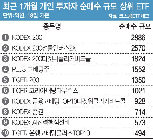 20일 코스콤 ETF 체크에 따르면 최근 한달 개인 투자자의 순매수 규모 상위 10위권 내 ETF에는 모두 국내 주식형 상품이 이름을 올렸다. 이 기간 개인 투자자들이 가장 많이 순매수한 ETF는 코스피 200지수를 추종하는 ‘KODEX 200’으로, 2886억원 규모를 순매수한 것으로 집계됐다.