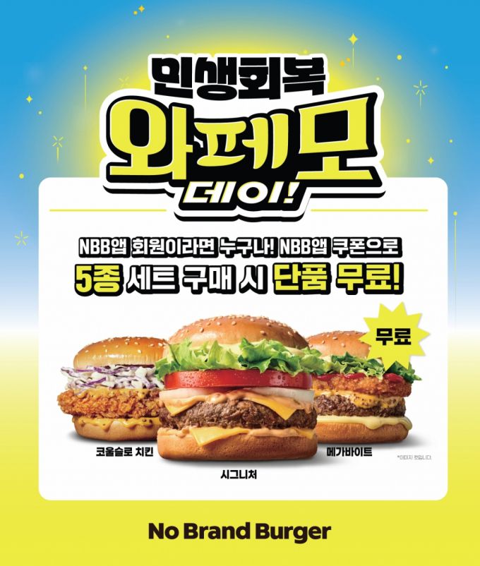 노브랜드 버거는 이달 21일부터 27일까지 일주일간 NBB앱에서 △시그니처 △메가바이트 △멕시칸 칠리 치즈 △오리지널 새우 △코울슬로 치킨 등으로 세트 5종 구매시 동일 버거 단품을 무료로 준다.