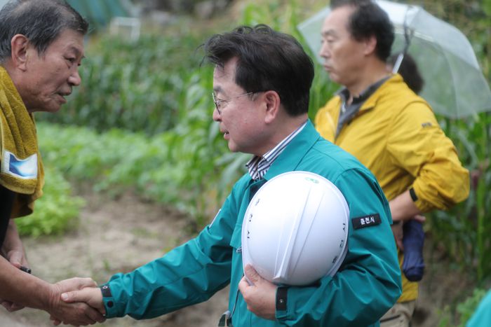 육동한 시장이 20일 호우 피해지인 사북면 지암리 현장에서 주민을 위로하고 있다. 사진|춘천시청 |