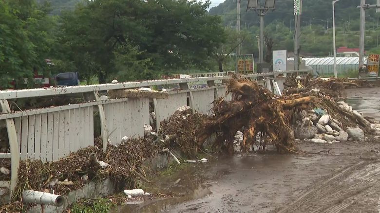 네, 이곳 마을은 흙더미가 완전히 집어삼켜그야말로 아수라장입니다. 보시다시피 순식간에 밀려든 토사에주택은 물론 편의점 건물까지 통째로 앞으로 쓸려 내려오기까지 했는데요. 앞부분이 뻥 뚫린 채 처참한 모습입니다. 그 옆으로는 도로 아스팔트가 일부 떨어져 나온 것도 보이고요. 뿌리째 뽑힌 나무들과 온갖 잔해가 뒤엉켜서 어지럽습니다. 불삭기 같은 중장비가 토사를 걷어내고는 있지만 치워도 치워도 끝이 보이지 않습니다. 도로는 여전히 진흙 범벅이라서 근처 야산과의 경계가 구분조차 안 되는 상황입니다.