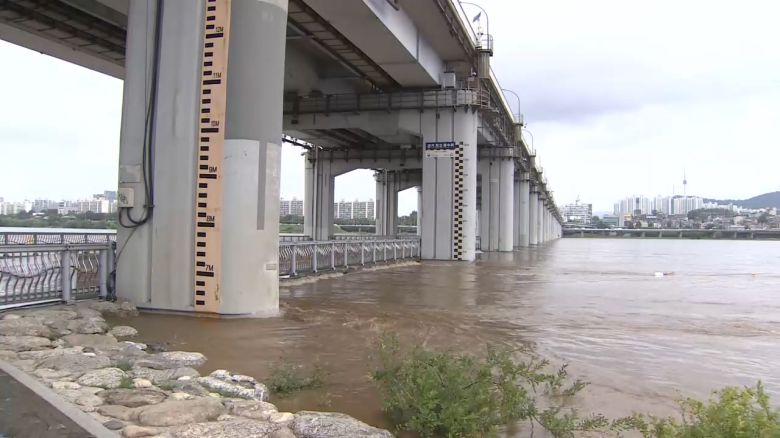 한강물 유속이 빠르게 흐르는 가운데, 잠수교 다리는 흙탕물에 잠겼습니다.