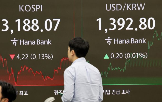 18일 오후 서울 중구 하나은행 딜링룸 전광판에 코스피가 전 거래일 보다 4.22포인트(0.13%) 내린 3188.07 포인트를 나타내고 있다. 원달러 환율은 0.20원(0.01%) 오른 1392.80원. /사진=뉴시스 /사진=배훈식 |