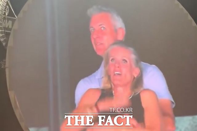 지난 16일(현지시간) 미국 매사추세츠주 보스턴에서 열린 콜드플레이 공연에 함께 갔다가 관중석을 비춘 카메라 때문에 불륜 행각이 들킨 IT 기업 아스트로노머의 앤디 바이런(파란셔츠) CEO와 크리스틴 캐벗 CPO. /소셜미디어 캡처 |