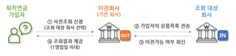 새로 도입되는 사전조회 서비스를 활용하면 가입자가 보유한 DB·DC·IRP 계좌 상품이 원하는 사업자에 실물이전 가능한지 미리 파악할 수 있다. 사전조회는 현재 연금 계좌가 있는 '이관회사'의 홈페이지나 앱을 통해 신청할 수 있으며, 조회 결과는 신청 다음 영업일까지 제공된다.