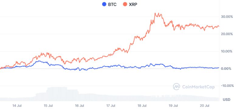 최근 7일간 비트코인(BTC)과 리플(XRP) 시세 비교 (출처=코인마켓캡) |
