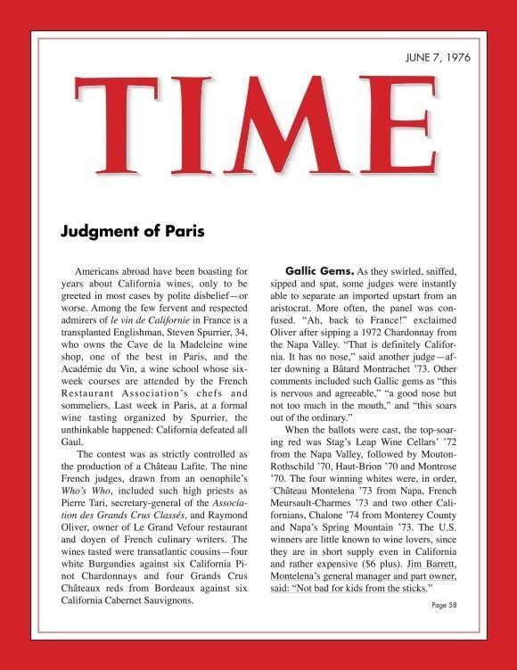 심사 결과는 당시 기자로서는 유일하게 현장에서 취재하던 타임(TIME)지 특파원 조지 M. 테이버 덕분에 그해 6월 7일자 타임지에 ‘파리의 심판(Judgement of Paris)’이라는 제목으로 실리게 됩니다. 기사는 “깜짝 놀랄 일이 일어났다. 캘리포니아가 골(Gaul 프랑스의 옛 이름)을 이겼다”고 전합니다. 프랑스 와인업계는 충격적인 패배를 인정할 수 없어서 10주년인 1986년과 30주년인 2006년 같은 와인으로 재대결을 벌였지만 역시 미국의 승리로 돌아가 파리의 심판이 우연이 아니었음을 입증합니다.