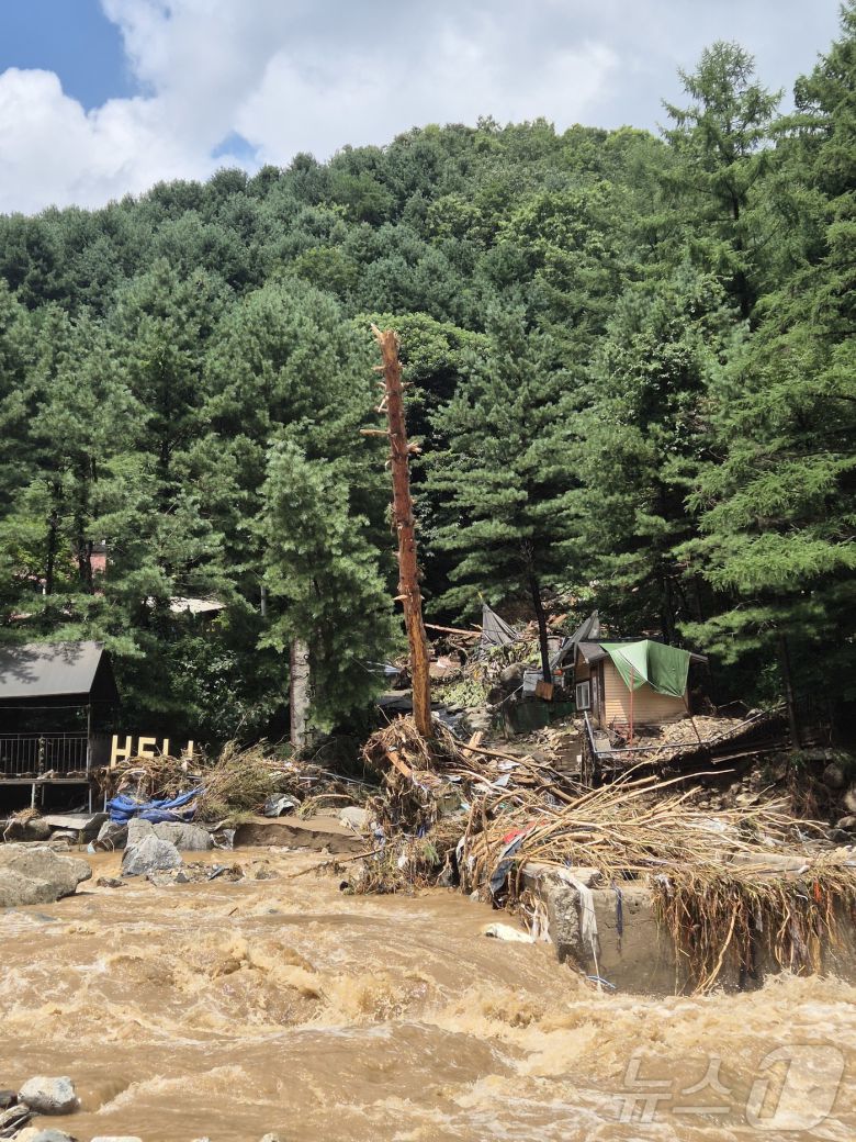 (가평=뉴스1) 양희문 이상휼 기자 = "새벽에 '쾅' 소리가 나서 밖에 나가봤더니 산이 무너져 내렸더라고. 그 아래 글램핑장에 일가족 3명이 있었는데 그대로 매몰된 거지. 제발 살아야 할 텐데…."