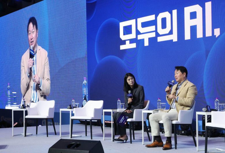 최태원 대한상공회의소 회장이 18일 경북 경주 라한셀렉트에서 열린 제48회 대한상의 하계포럼 AI 토크쇼에 참석해 발언하고 있다. 사진=대한상공회의소 |