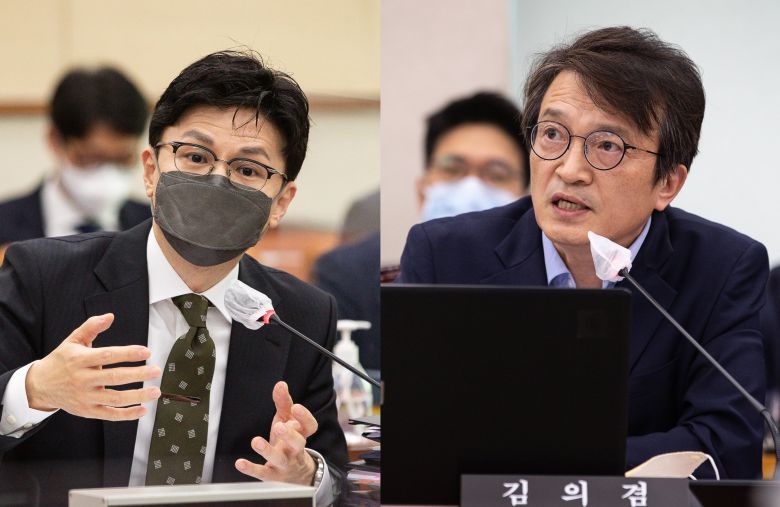 지난 2022년 10월 국정감사에서 한동훈 당시 법무부장관(왼쪽)과 김의겸 더불어민주당 의원이 설전을 벌이는 모습./뉴스1