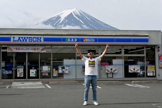 지난해 5월 일본 야마나시현 가와구치코의 ‘후지산 편의점’으로 유명한 로손 편의점 앞에서 한 관광객이 사진을 위해 포즈를 취하고 있다. [사진 = 연합뉴스] |